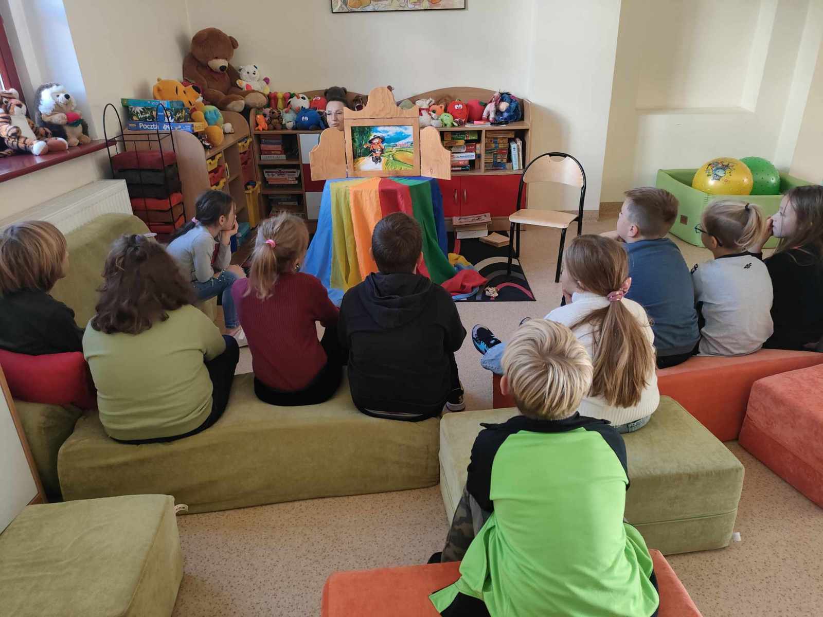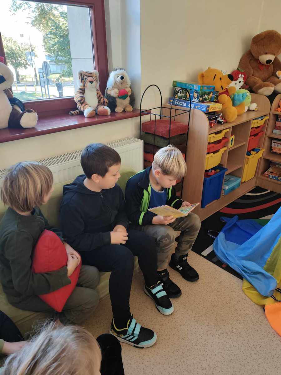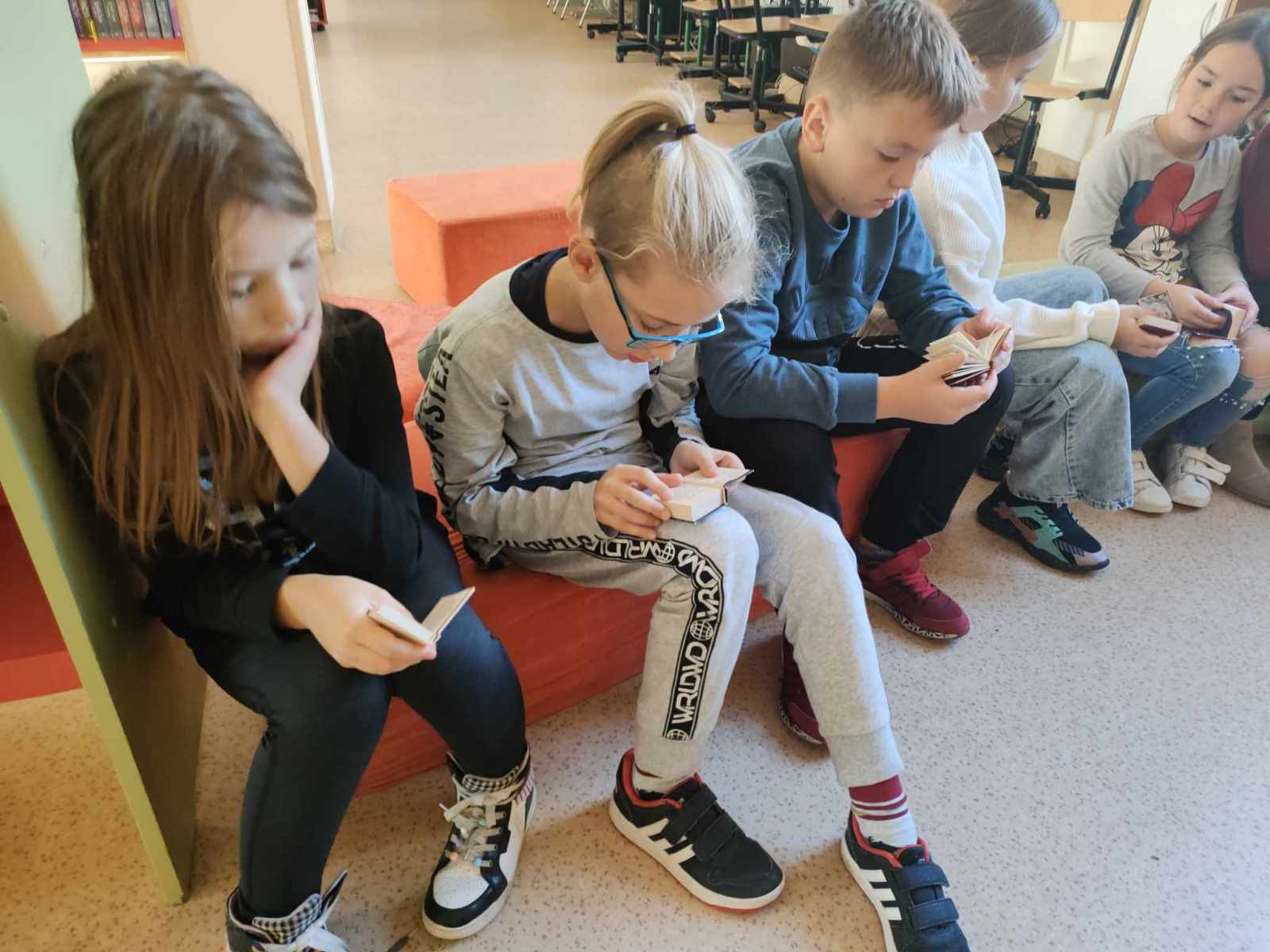 , zobaczyli jak wyglądają zniszczone książki- przypomnieli zasady ich użytkowania oraz nauczyli się je obkładać , wspólnie-każdy po fragmencie- przeczytali wiersz „Rzepka”, zobaczyli wspaniałe miniaturowe książki kieszonkowe