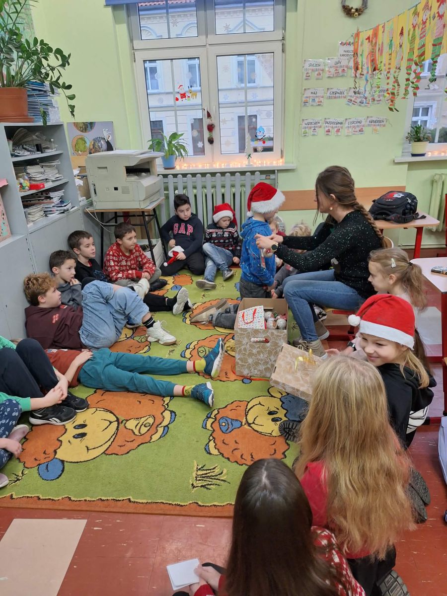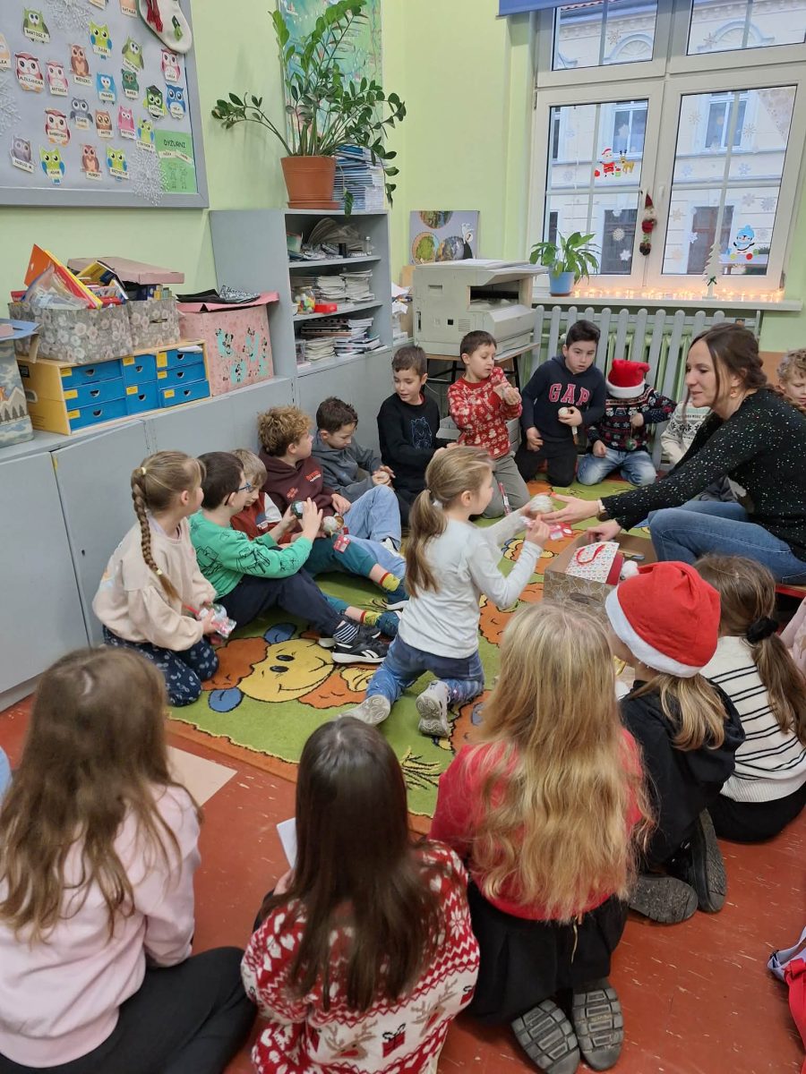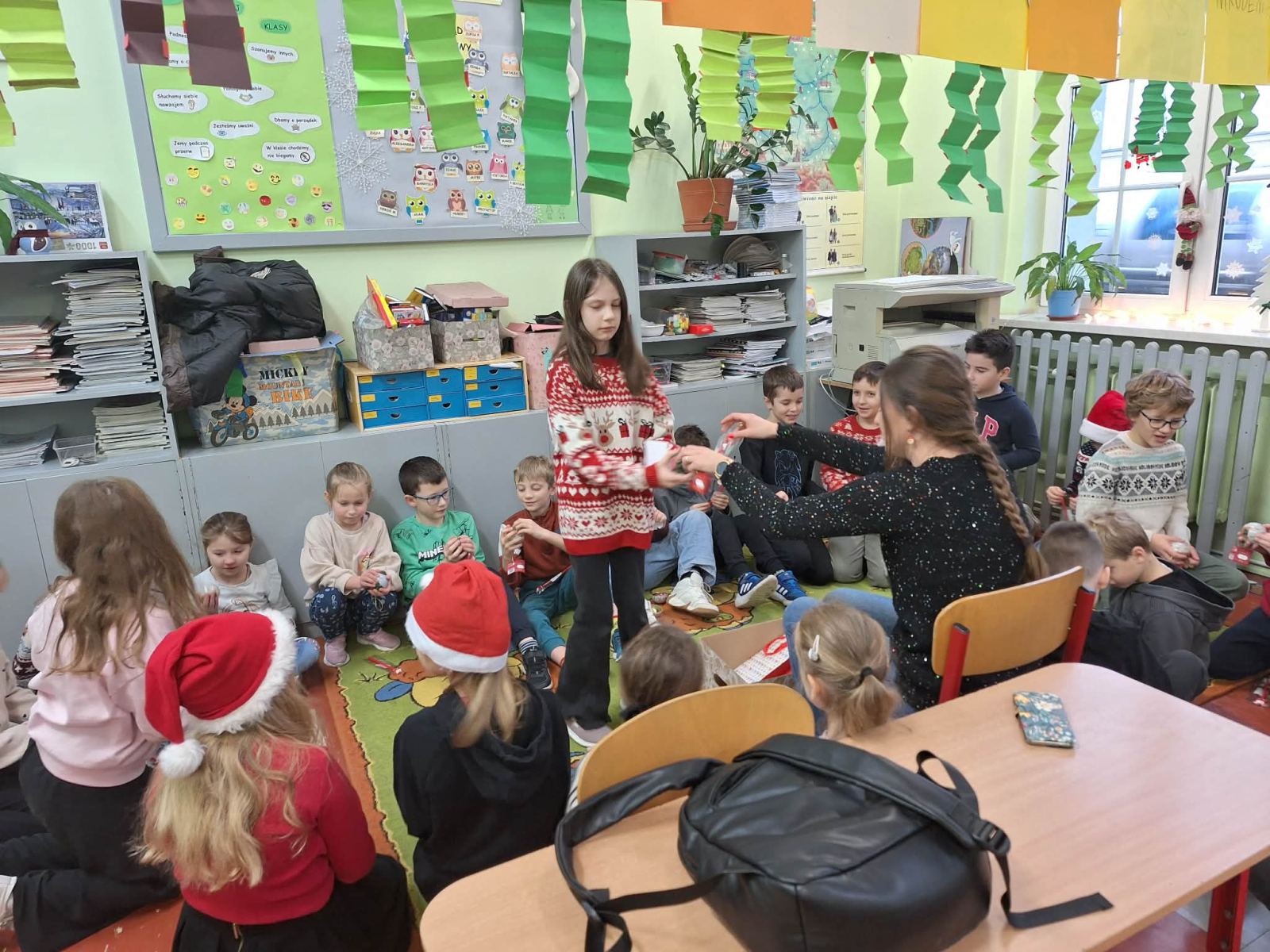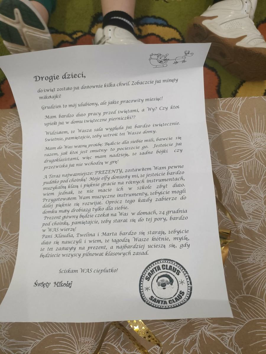 Uczniowie dostali list od Mikołaja, magiczne pudełko pełne instrumentów do wspólnego muzykowania 🥁🪇🎼oraz każdy otrzymał mikołajkowy długopis oraz słodki upominek 😉 Największym prezentem tego dnia, był jednak wyjazd do Olsztyna na warsztaty robienia akrylowych bombek w Strefie Przygody oraz spacer świątecznie ustrojoną olsztyńską starówką🎄