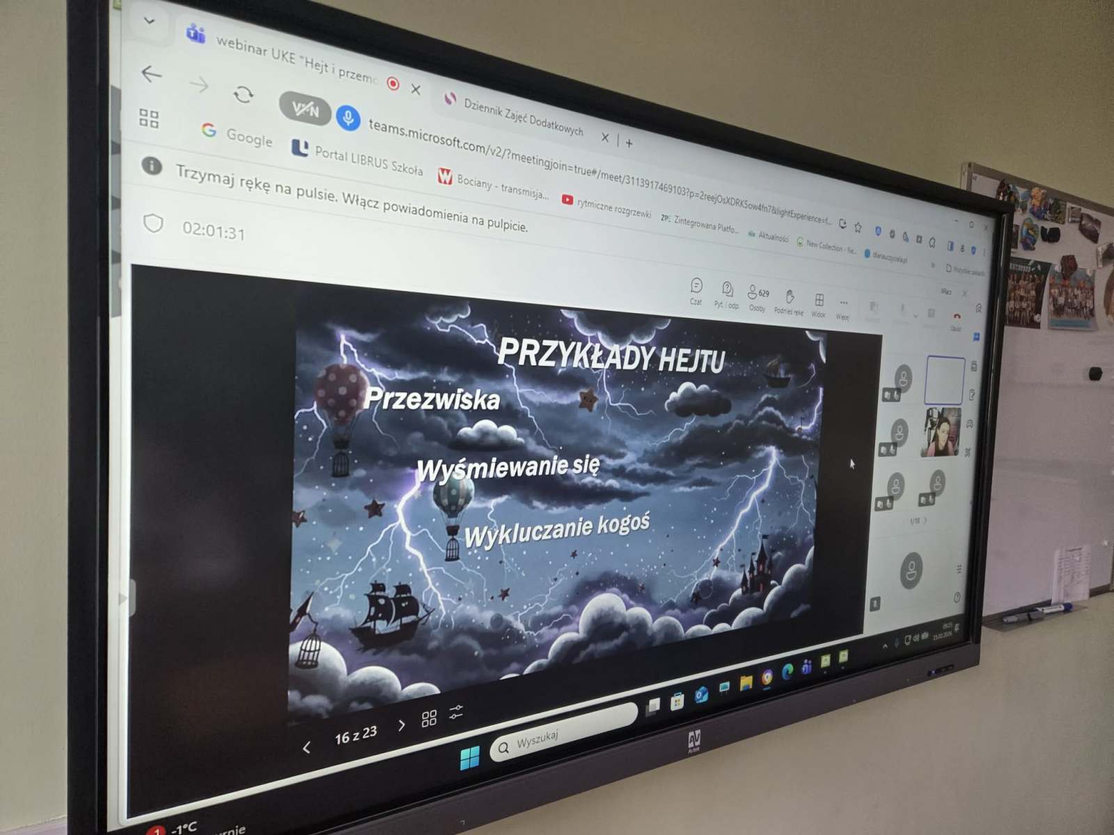 Uczniowie dowiedzieli się czym jest hejt i przemoc w Internecie, jak je rozpoznać i bezpiecznie reagować na takie sytuacje, dbając o swój komfort i bezpieczeństwo cyfrowe, jak radzić sobie z agresją online i gdzie szukać pomocy w razie konieczności.