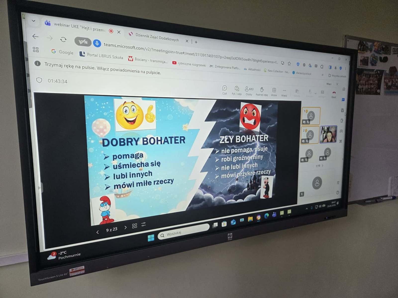 W tym tygodniu uczniowie klas 2 oraz 3 mieli okazję wziąć udział w webinarze: „Hejt i przemoc w sieci”. Spotkanie miało na celu nauczyć najmłodszych, jak odpowiedzialnie i bezpiecznie korzystać z Internetu oraz jak być „superbohaterem” w cyfrowym świecie.![]()
