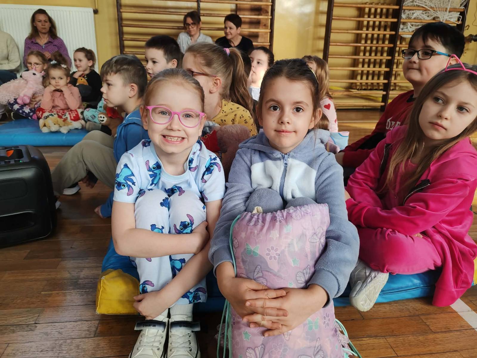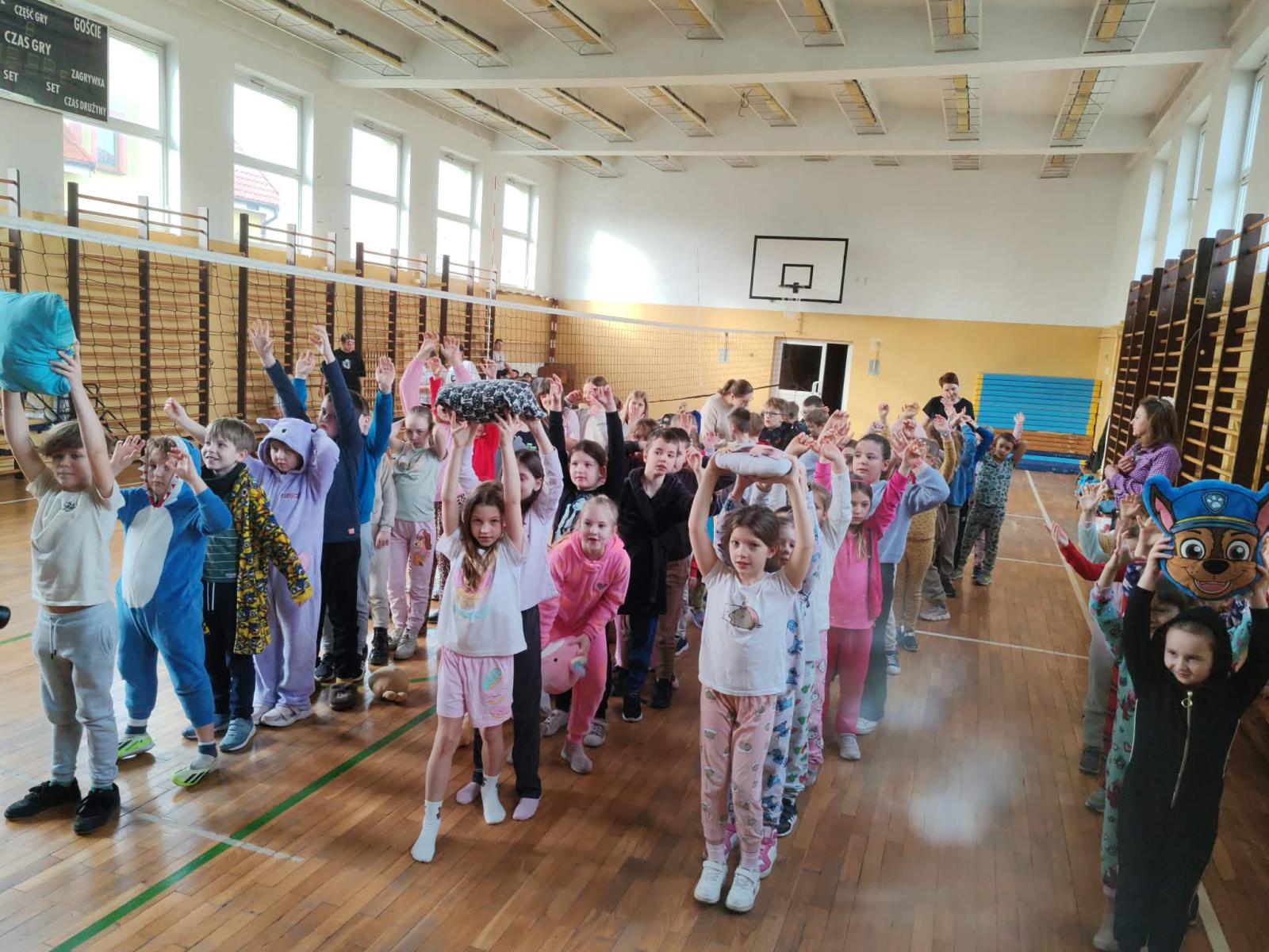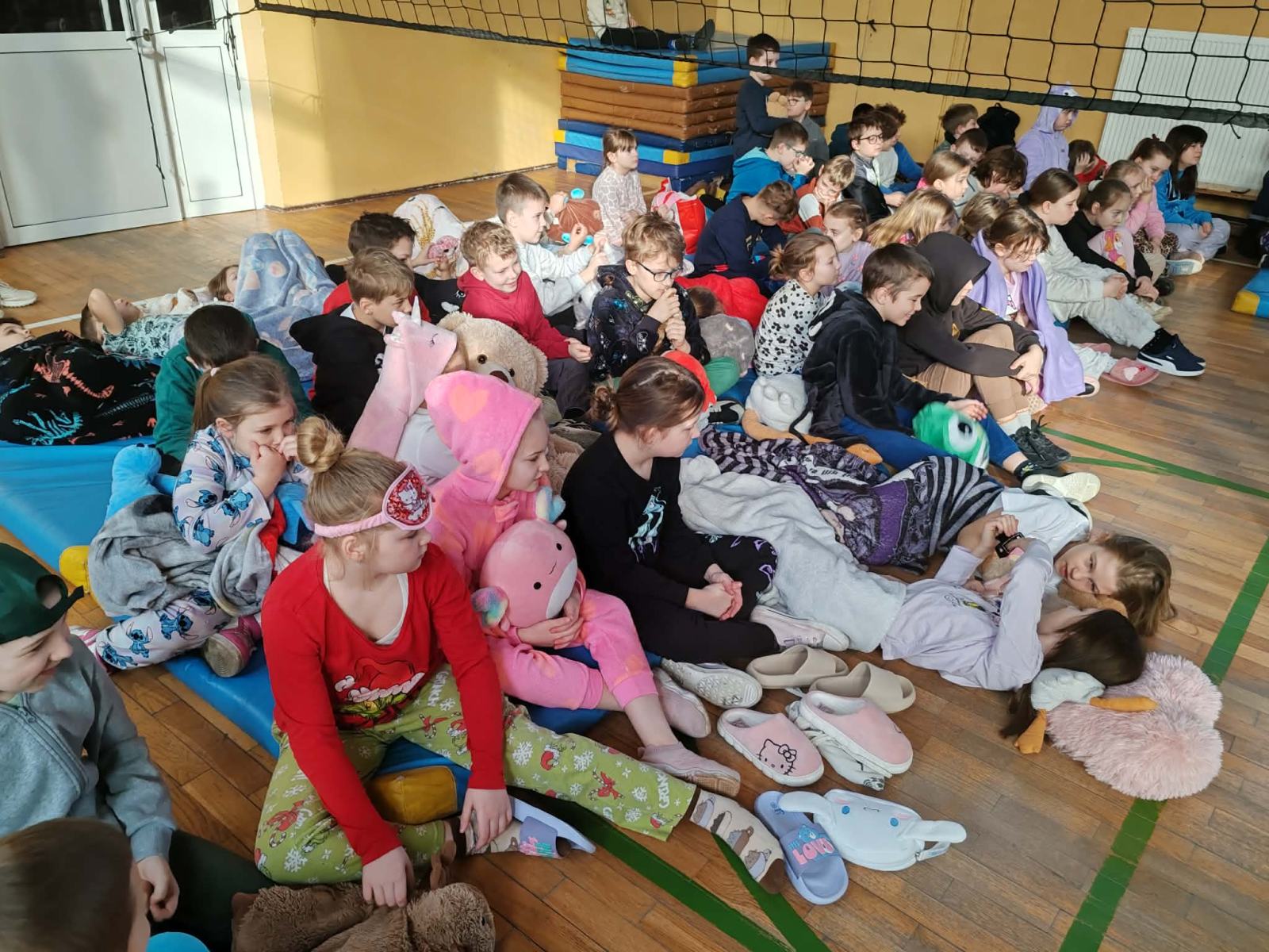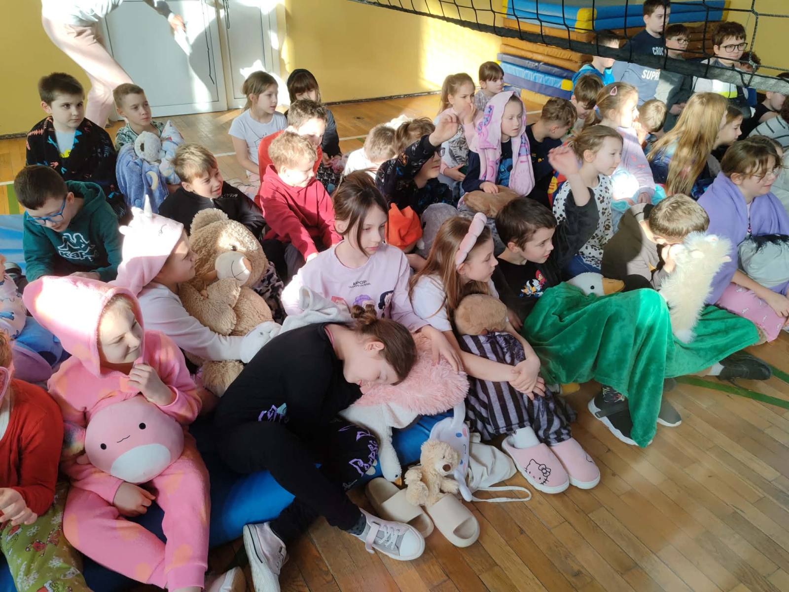 Tego dnia uczniowie klas 0-3 przyszli do szkoły w piżamach, przynosząc ze sobą przytulanki, poduszki oraz koce, co stworzyło miłą i przyjazną atmosferę.