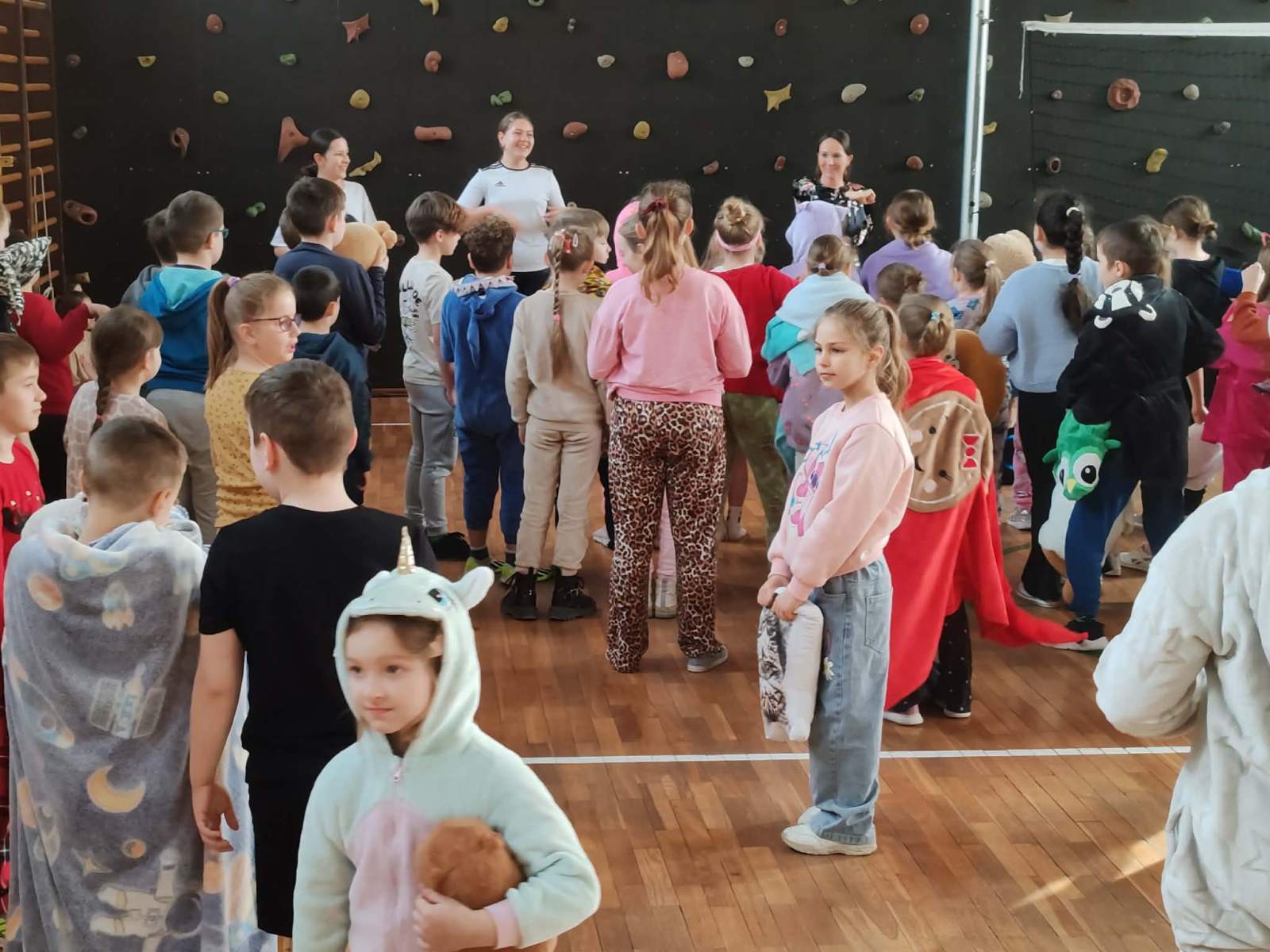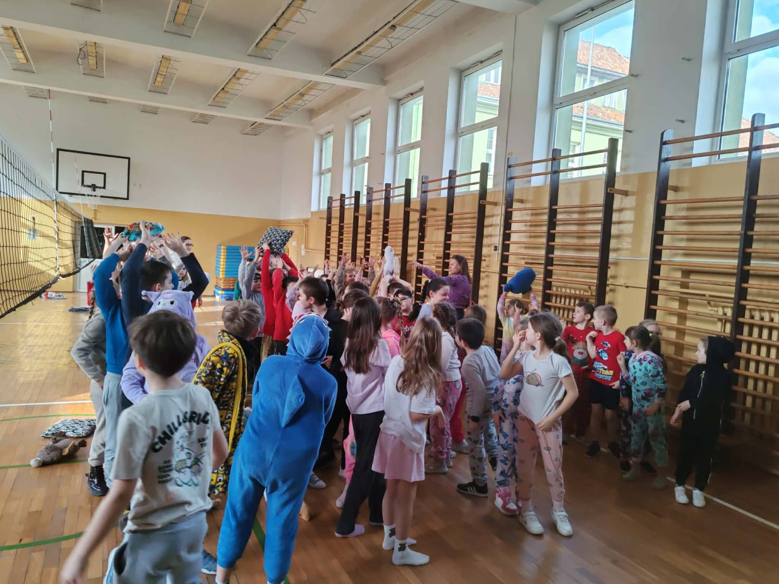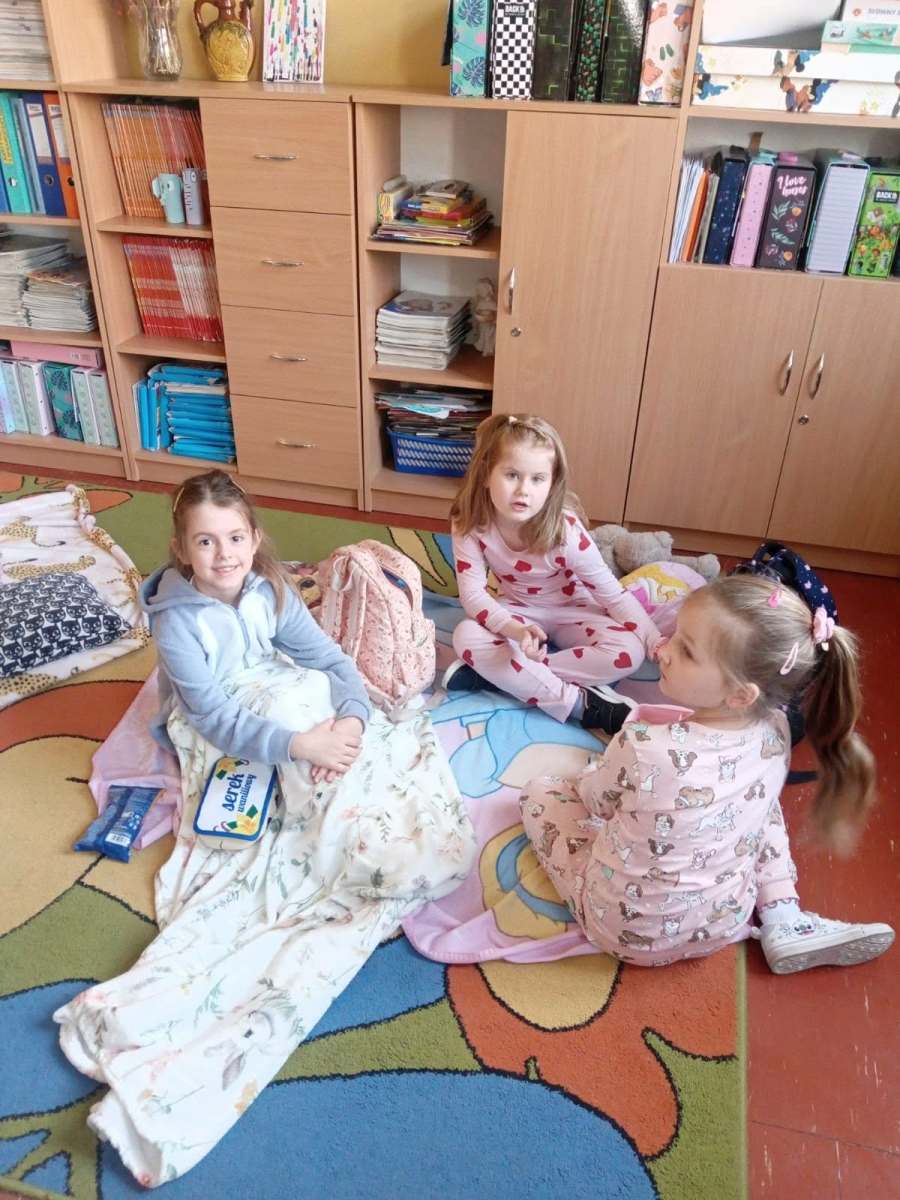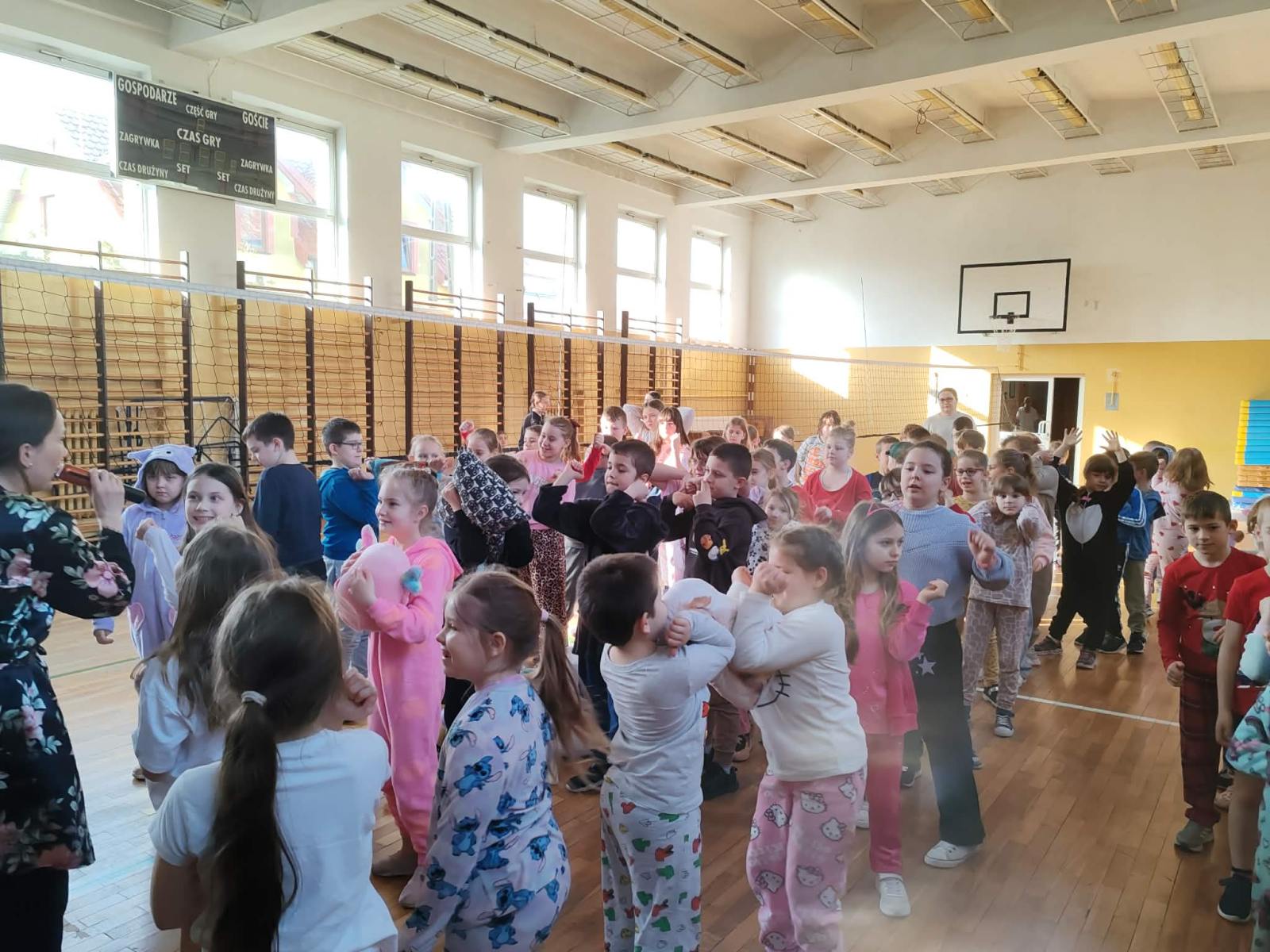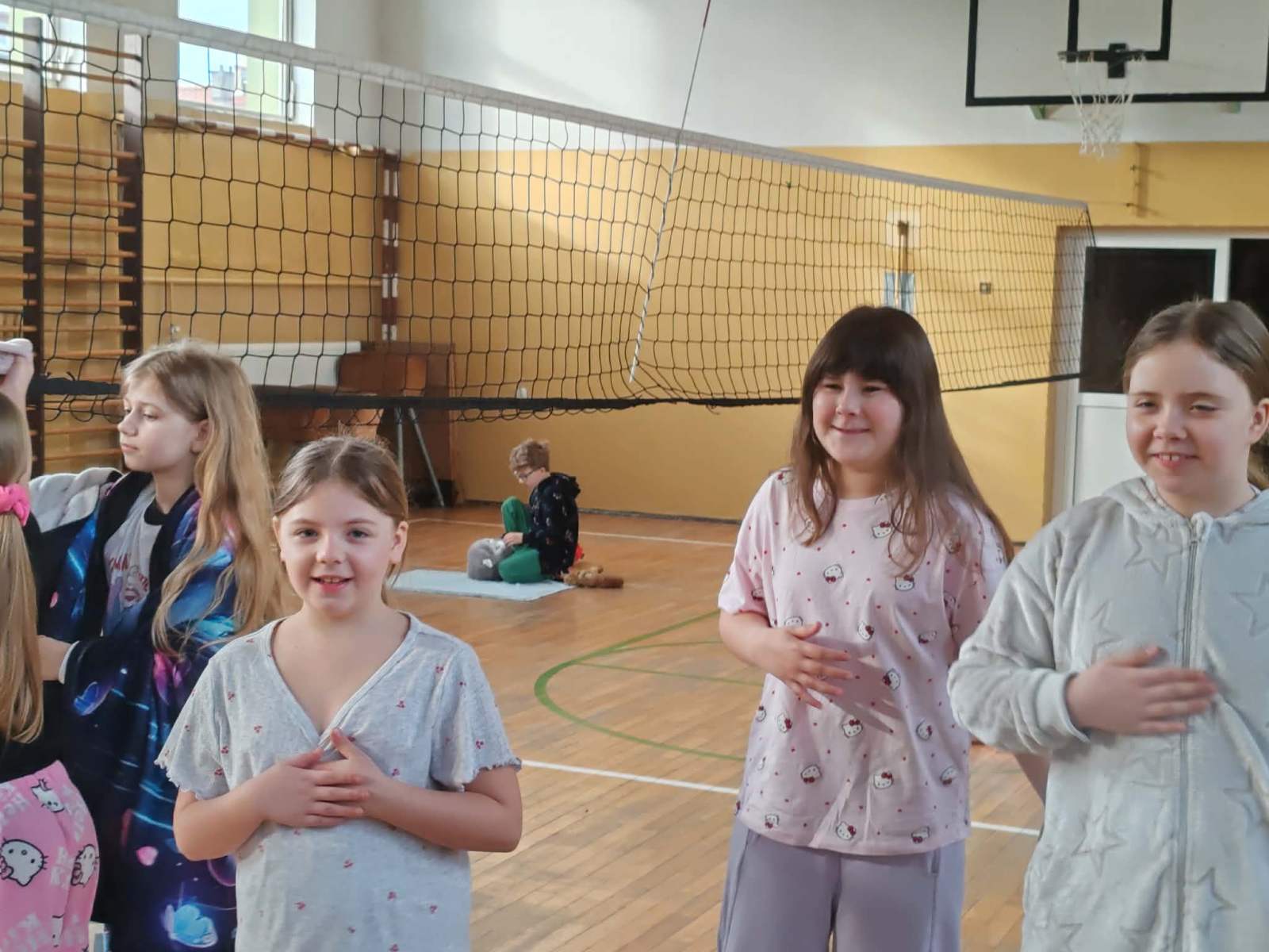 Tego dnia uczniowie klas 0-3 przyszli do szkoły w piżamach, przynosząc ze sobą przytulanki, poduszki oraz koce, co stworzyło miłą i przyjazną atmosferę.
