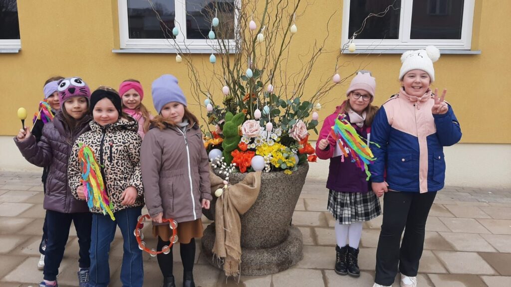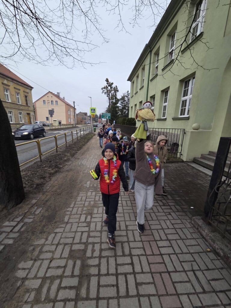 Uczniowie klas 0-2 w wiosennym pochodzie na powitanie wiosny🪻